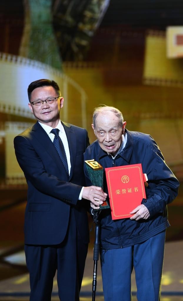 94岁的战地记者张崇岫(右)在第十四届中国摄影艺术节上获得“中国文联终身成就奖(摄影)”。新华社记者 吴刚 摄