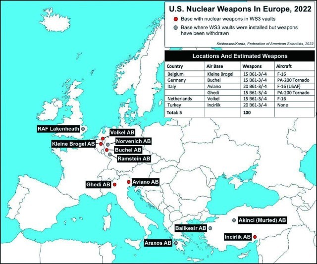 对于许多参与国来说,有关该计划的具体细节属于机密,政治上很敏感,其中一些国家甚至不公开承认美国在其领土上存放核武器。美国科学家联合会(FAS)估计,截至去年10月,总共约有100枚B61核航弹部署在比利时、德国、意大利、荷兰和土耳其5个国家的6个基地,每个基地部署15-20枚。而过去估计在欧洲多个基地存放着高达150枚到200枚炸弹。