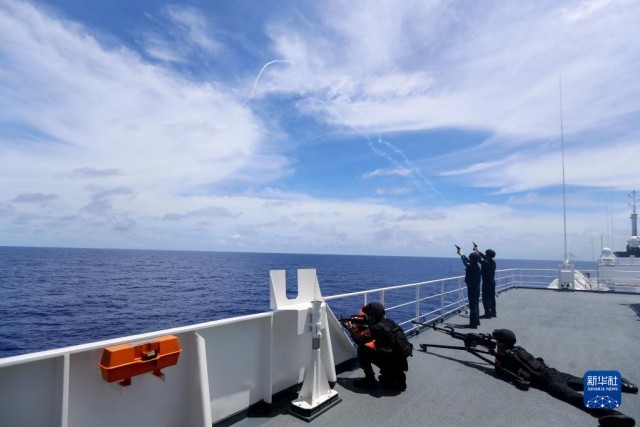7月10日,中国海军“和平方舟”号医院船在太平洋上组织反恐反海盗演练。这是随船火力组发射信号弹警告“海盗艇”。新华社发(徐巍 摄)