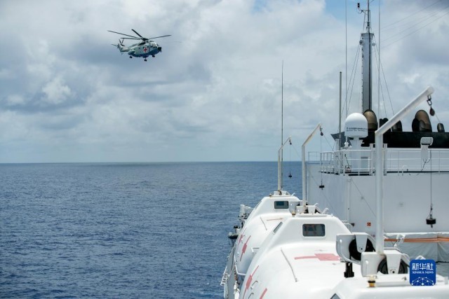 7月10日,中国海军“和平方舟”号医院船在太平洋上组织反恐反海盗演练。这是舰载直升机前出查证。新华社发(黎宇 摄)