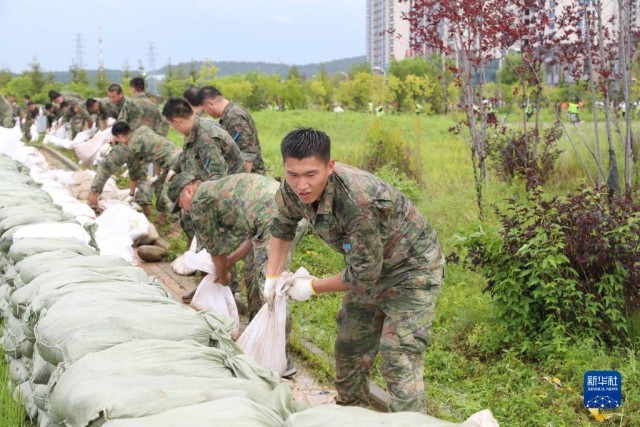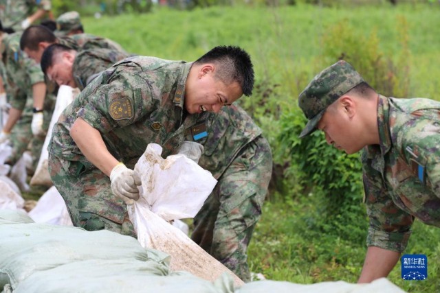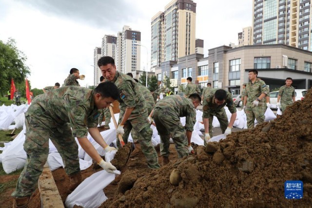 北部战区空军航空兵某旅组织官兵在黑龙江省牡丹江市东安区环江南街装填沙袋(8月5日摄)。新华社发(陈浩 摄)