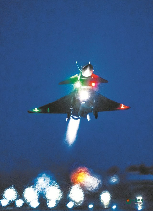 夜幕沉沉,繁星点点。绿色信号弹划破长空,数架战机加力起飞,绚丽尾焰在夜空中格外耀眼。