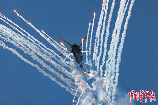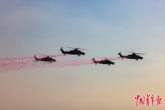 北方初秋的上午,阳光依旧散发着暑气。一架架直升机划过天津万里无云的碧空,地面的人群保持仰视,如同向日葵一般,跟随飞机的轨迹变换视线。当陆军航空兵飞行员驾驶直-10武装直升机做出俯冲90度的“莱维斯曼”动作时,观众中爆发出一阵欢呼。