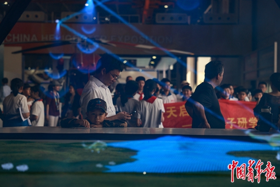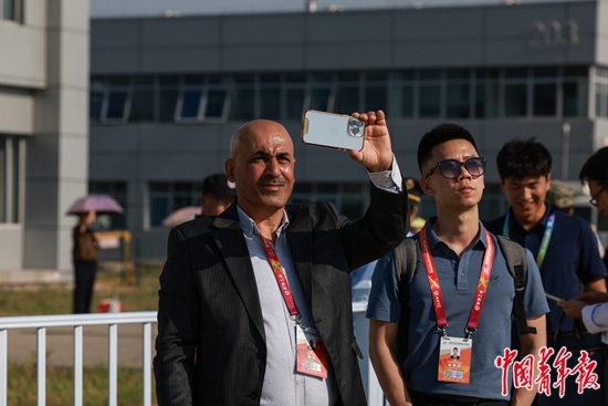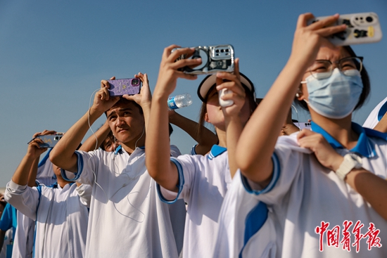 天津市双港中学的高中生们在烈日下仰望战机的轨迹,来自新疆巴州轮台县的内地班学生杰苏尔·阿不来提第一次看飞行表演,十分激动,举着手机录像的手始终没放下来。他说自己小时候就有当飞行员的梦想,因为种种原因无法实现,这次参观直博会,“算是圆了一个梦”。