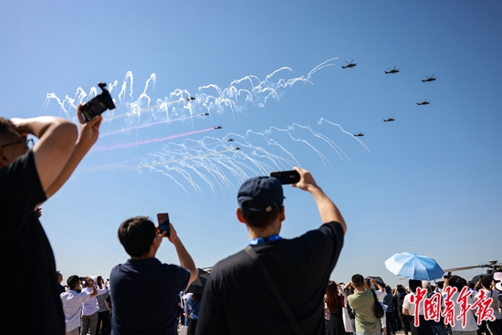 飞行表演结束时,完成最后一个课目的陆航直升机即将飞离表演区域,观演的学生和小朋友纷纷向天空挥手告别。或许,一颗从军报国的种子已在他们心中悄然种下。