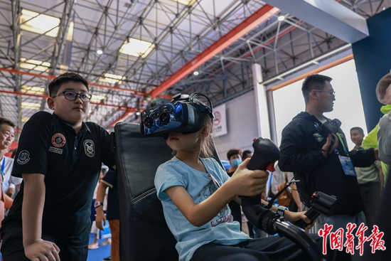 9月15日,天津,第六届中国天津国际直升机博览会上,一名7岁的小女孩体验米-17直升机模拟训练系统。