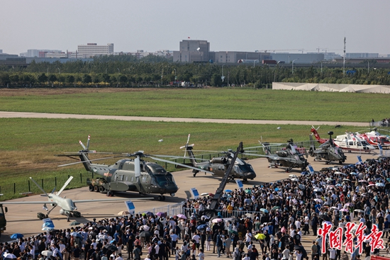 9月15日,天津,第六届中国天津国际直升机博览会上,人们聚集在户外,等待观看直升机飞行表演。他们面前从左至右依次陈列着KVD002中空长航时无人机系统、直-8L运输直升机、直-20战术通用直升机、直-10武装直升机、直-19武装直升机等五架陆军航空直升机。