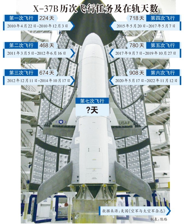 此外,从历次飞行任务来看,X-37B在轨道上停留的时间越来越长。《空军与太空军杂志》网站称,它的上一次飞行持续了908天,从2020年5月17日到2022年11月12日。之前的任务持续时间分别是780天(2017年9月7日至2019年10月27日)、718天(2015年5月20日至2017年5月7日)、674天(2012年12月11日至2014年10月17日)、468天(2011年3月5日至2012年6月16日)和224天(2010年4月22日至2010年12月3日)。如果延长任务在轨天数的趋势继续下去,X-37B的此次任务要到2026年6月或更晚才会着陆。目前还不清楚这架太空飞机还能承受多少次飞行。报道称,2020年,当萨尔茨曼还是中将时,他暗示飞船可能已接近试验尾声。