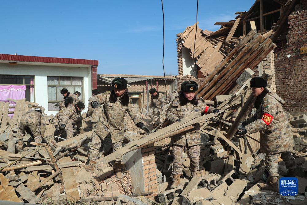 12月20日,陆军第76集团军某旅官兵在积石山县大河家镇陈家村清理废墟。新华社发(冯彦荣 摄)