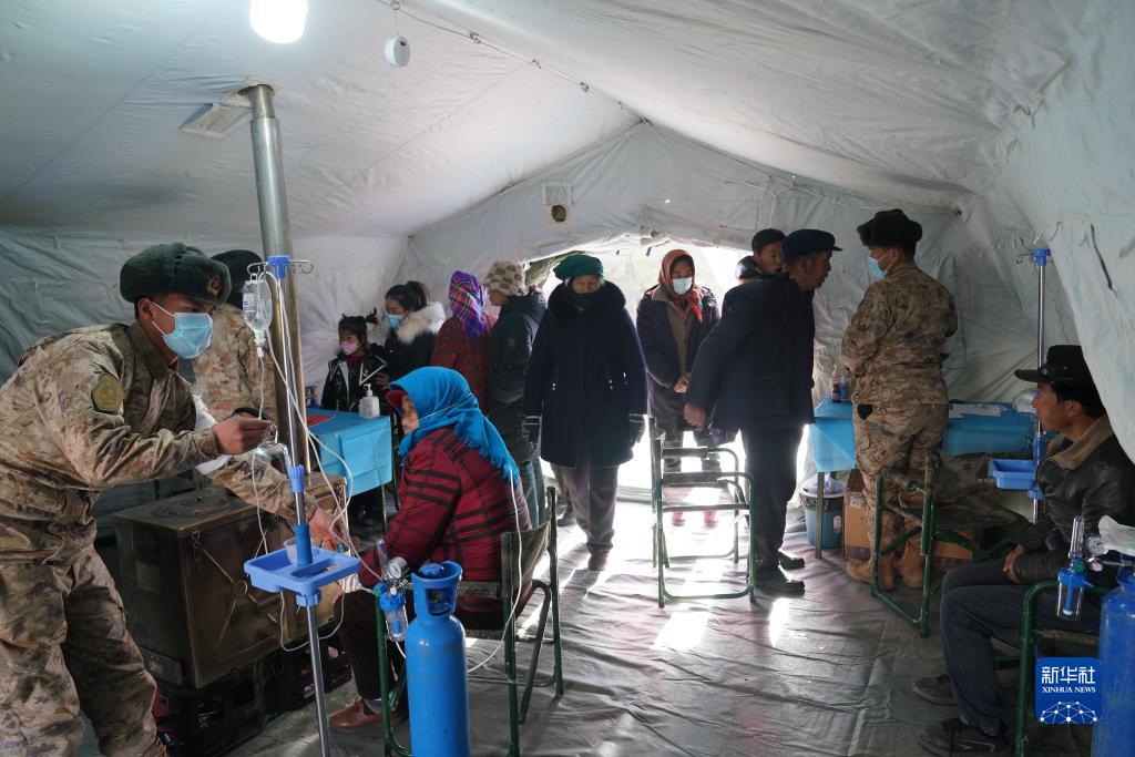 12月20日,陆军第76集团军某旅官兵在积石山县石塬镇安置点为受灾群众提供医疗服务。新华社记者 张永进 摄