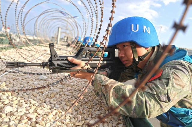 中国第22批赴黎巴嫩维和建筑工兵分队组织开展应急防卫演练。胡光明/摄