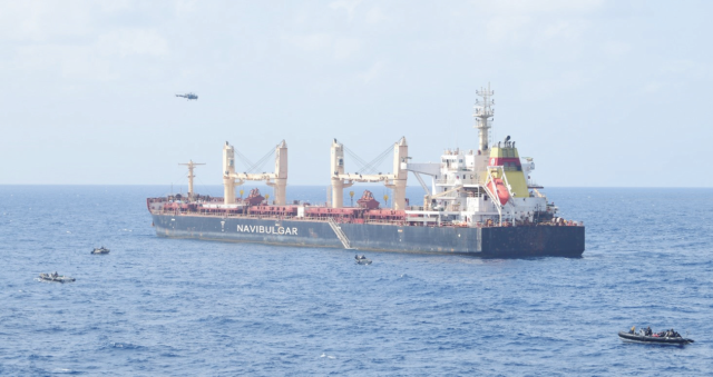 敌对行动升级后,印军决定加强对“鲁恩”号货轮的监视力度,派出一架隶属于印度海军第316航空中队的P-8I反潜巡逻机和一架无人侦察机加入了持续跟踪和监视行动,并启动反海盗、反劫持任务部署。为此,印度空军出动了1架美制C-17大型运输机,机上搭载了数艘橡皮突击艇和多名精锐的印度海军陆战队突击队队员。他们从印度本土出发,经过十余个小时的长途飞行,抵达事发海域。C-17运输机抵达“鲁恩”号货轮附近后,实施了精准空投,首先将两艘橡皮艇利用先进空投系统,空投到被劫持货轮前方海域,印度海军陆战队突击队队员随后协同空降,在海面完成“人艇结合”,驾驶橡皮艇迅速扑向“鲁恩”号。面对印军的海空突袭,海盗毫无准备,最终束手就擒,这次解救被劫持货轮的行动取得了圆满成功。