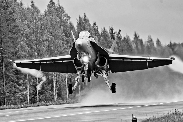 演习中,芬兰空军F/A-18战机降落在芬兰的一条公路上。供图:阳 明