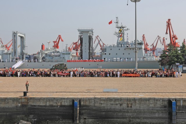 5月17日上午,由导弹驱逐舰乌鲁木齐舰、导弹护卫舰临沂舰和综合补给舰东平湖舰组成的海军第45批护航编队,在历经249个昼夜、5万余海里航程,圆满完成护航、联演及顺访任务后,返回青岛某军港。
