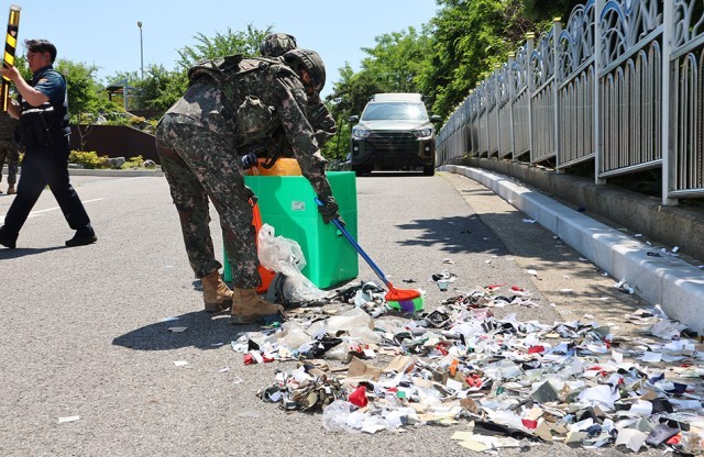 当地时间2024年6月2日,韩国仁川,士兵检查气球携带的垃圾。 澎湃影像 图