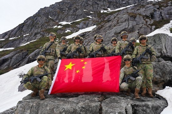 近日,三连官兵对海拔4400多米的某点位进行武装巡逻,官兵到达点位后展开国旗宣示主权。