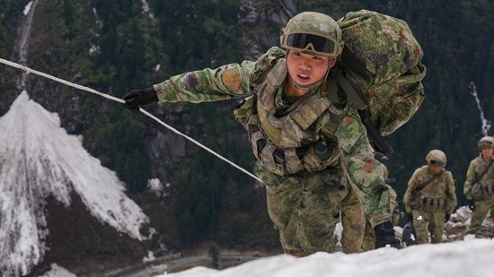 近日,三连官兵巡逻途中利用绳索通过陡峭的冰雪地带。