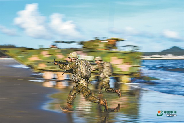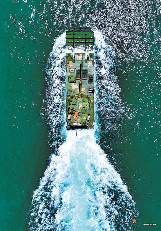 “泛水编波,执行!”抵达目标海域,随着指挥员一声令下,多种两栖战车有序驶离舰艇,快速向岸滩发起冲击。