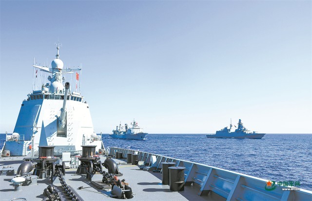 近日,结束访问埃及的中国海军第46批护航编队焦作舰、洪湖舰,与埃及海军“加拉拉”号护卫舰在地中海举行海上联合演练。此次演练包括通信协同、编队运动、航行补给占位等内容。图为联合演练期间中埃舰艇列阵大洋。张大禹摄