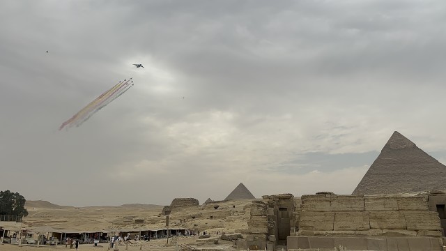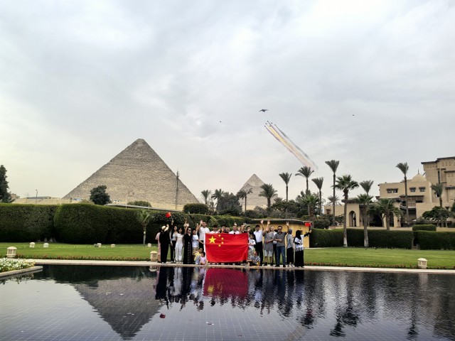 1956年5月30日,中埃两国建立正式外交关系,埃及成为第一个与中华人民共和国建交的阿拉伯和非洲国家。今天,中国空军飞机飞越金字塔,以特殊的方式将两种文明联系在一起,成为两国人民深厚情谊的美丽见证。