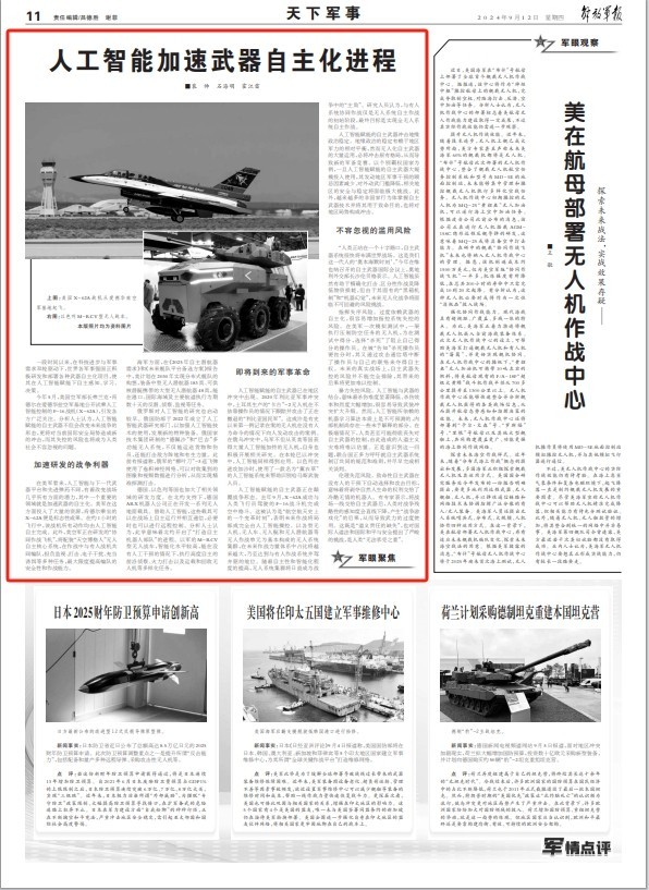 一段时间以来,在科技进步与军事需求双轮驱动下,世界各军事强国正积极研发和部署各种武器自主化项目,使其在人工智能赋能下自主感知、学习、决策。