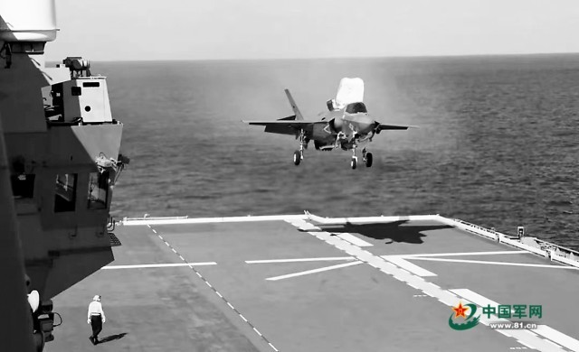 美国海军陆战队F-35B战斗机在“出云”号上进行起降测试。