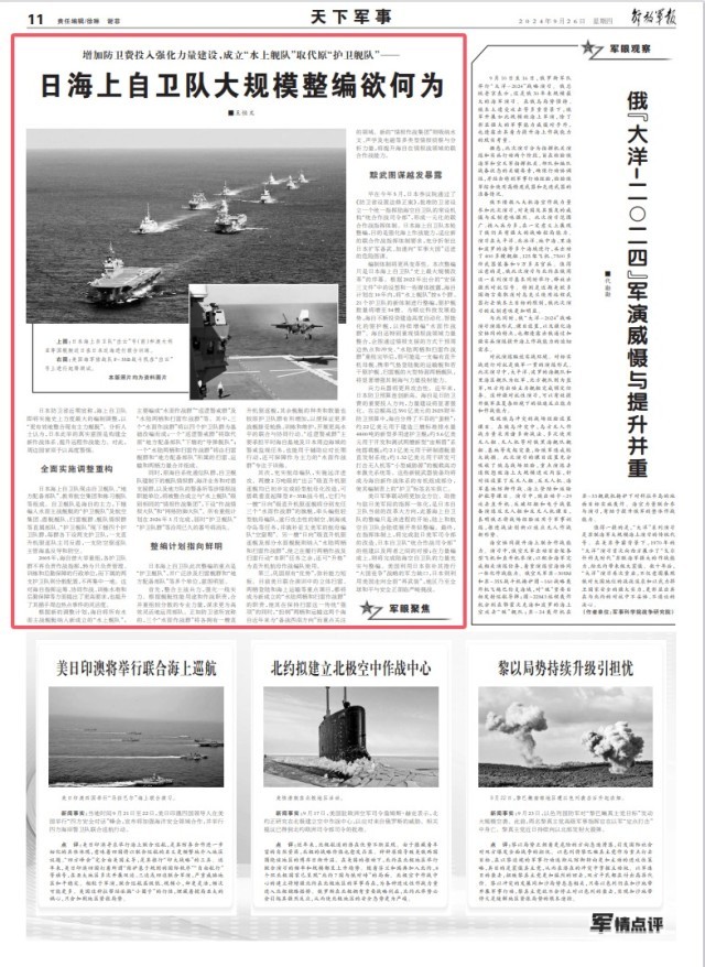 日本防卫省近期宣称,海上自卫队即将实施史上力度最大的编制调整,以“更有效地整合现有主力舰艇”。分析人士认为,日本此举的真实意图是构建全新作战体系、提升远程作战能力。对此,周边国家须予以高度警惕。