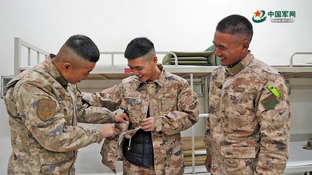 神仙湾哨所官兵试穿新申领的冬季作训服。图片由连队官兵提供