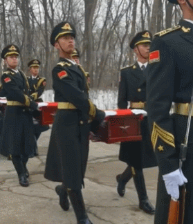 礼兵迈着无声、庄重的礼步抬起烈士棺椁