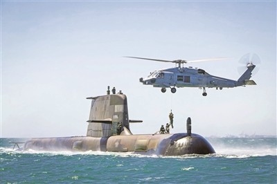 澳大利亚柯林斯级潜艇与直升机进行海上救生训练。