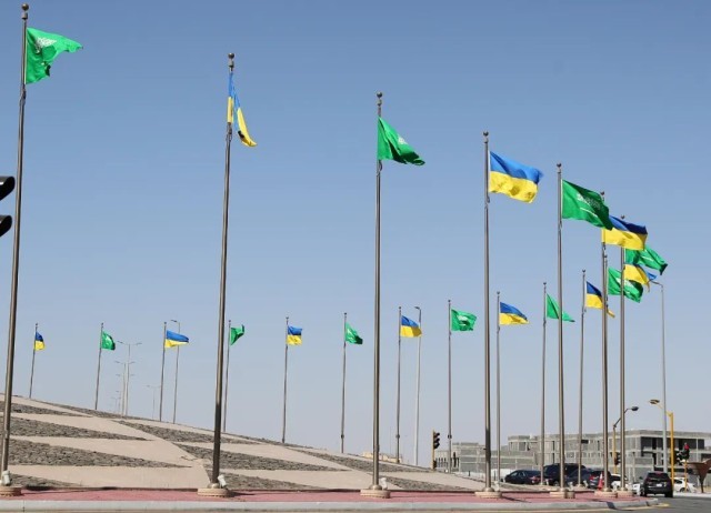 3月10日,在沙特阿拉伯吉达,沙特阿拉伯和乌克兰两国的国旗在道路旁飘扬。新华社记者王东震摄