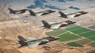 美空军一架F-16战斗机(左上)与F-35战斗机编队飞行。