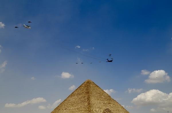 5月1日,中埃双方主要机型超低空编队飞越埃及金字塔,景区内,假日出行的观众不断挥手致意,争相拍照留念。