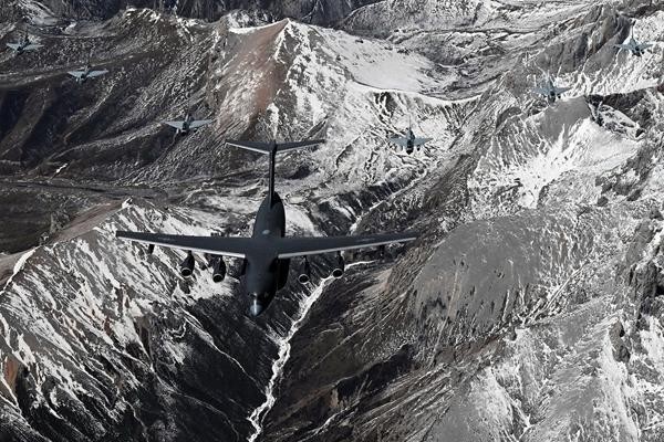 4月12日,中国境内,参加中埃“文明之鹰-2025”空军联合训练的运油-20和歼-10战机编队飞越雪山。余红春/摄