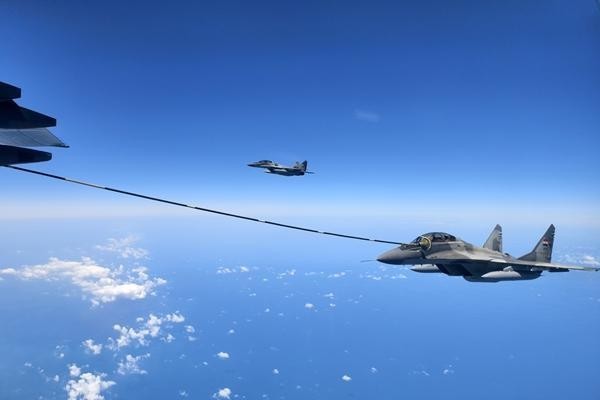4月28日,参加中埃“文明之鹰-2025”空军联合训练的中国空军运油-20飞机和埃及空军米格-29飞机进行空中加油训练。余红春/摄