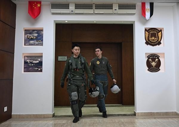 5月1日,埃及空军某基地,参加中埃“文明之鹰-2025”空军联合训练的中埃双方飞行员并肩前行。 余红春/摄