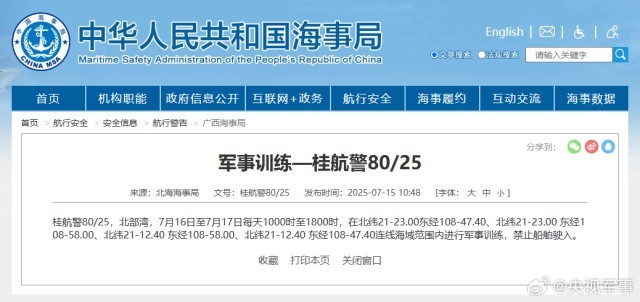 据中国海事局网站消息,北海海事局发布航行警告,7月16日至7月17日每天10时至18时,北部湾部分海域进行军事训练,禁止船舶驶入。