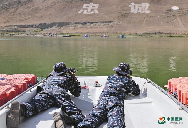 参赛队员在“搭乘舟艇水上狙击”课目竞赛中。