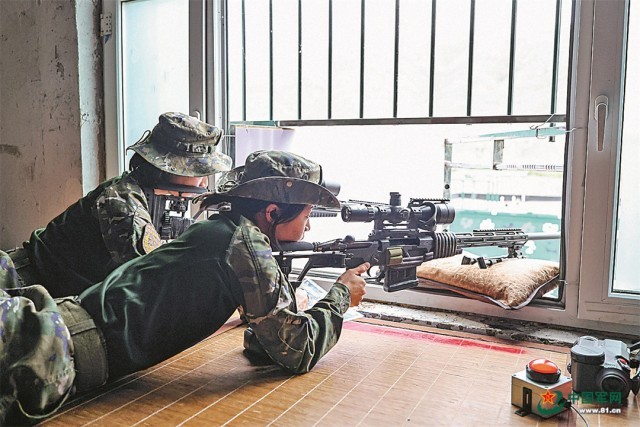 中国女参赛队员在“城市要点控守狙击”课目竞赛中。