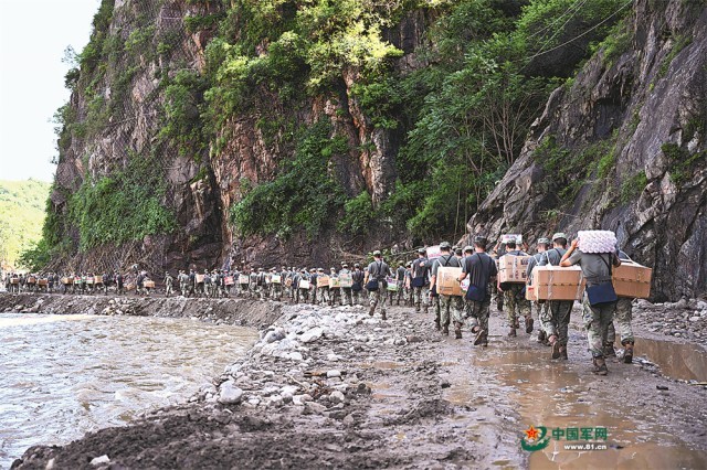 湍急的河水咆哮着冲击崖壁。面对险情,官兵无所畏惧,接力转移近百名被困群众。下午4时左右,官兵将被困群众全部转移到安全地域。短暂休整后,官兵又向着大山深处挺进……