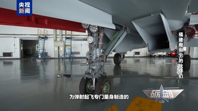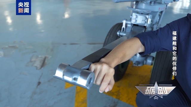 在沈飞的机库,记者看到两架歼15-T飞机一前一后停放着,歼-15T的“T”是汉语拼音“tán”的首字母。弹射杆是歼-15T飞机为弹射起飞专门量身制造的。它能直接钩住航母甲板上的电磁弹射器,瞬间就能把几十吨重的歼-15T从静止的状态加速到几百公里每小时,拽着战机冲离甲板。
