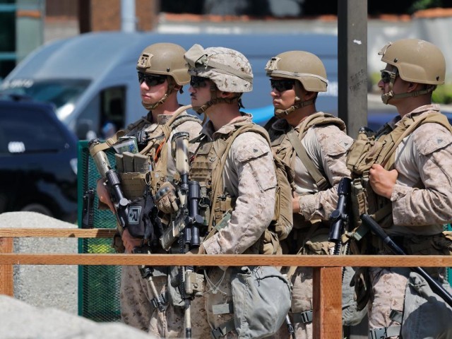2025年6月13日,美国海军陆战队士兵在洛杉矶威尔希尔联邦大楼的入口处站岗。新华社发(邱晨摄)