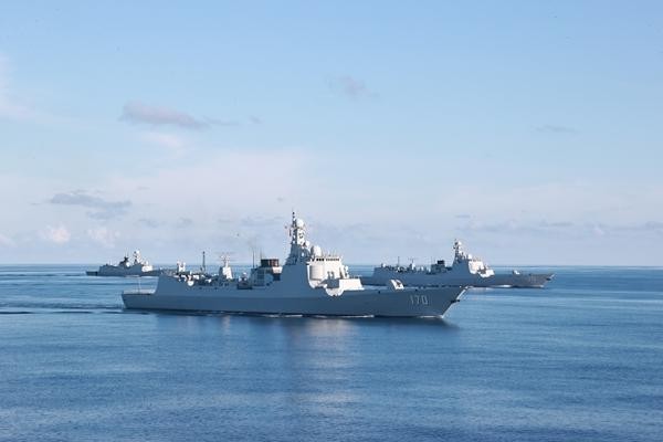 2025年,兰州舰与多型舰艇组成训练编队,在南海某海域开展多课目实战化训练。图为兰州舰编队开展占位课目训练。周天宇/摄