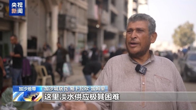 加沙城居民 易卜拉欣·加姆里:今年2月以来,我几乎没拿到任何援助。我住在(加沙城的)萨布拉社区,这里淡水供应极其困难,(没过滤干净的)咸水也是两天前才供应上。在这之前,我们这里已经断水一个多月了,我们每天都在忍受这些问题。
