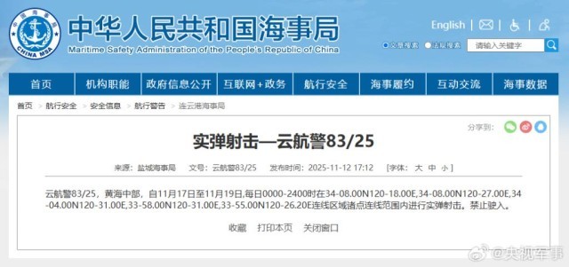 据中国海事局网站消息,盐城海事局发布航行警告,11月17日至19日,每日0时到24时,黄海中部部分海域进行实弹射击,禁止驶入。