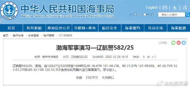 据中国海事局网站消息,葫芦岛海事局发布航行警告,12月27日12时至16时,渤海部分海域进行军事演习,禁止驶入。