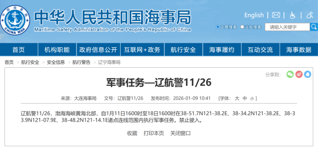 据中国海事局网站消息,大连海事局发布航行警告,1月11日16时至18日16时,渤海海峡黄海北部部分海域执行军事任务,禁止驶入。