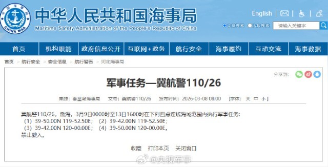 据中国海事局网站消息,秦皇岛海事局发布航行警告,3月9日0时至13日16时,渤海部分海域执行军事任务,禁止驶入。