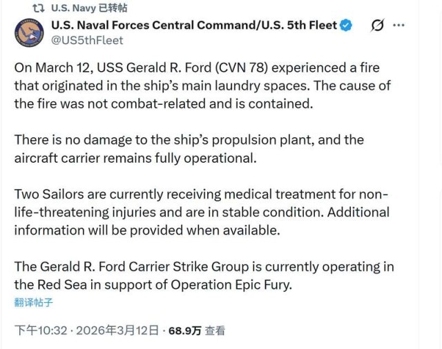 中国青年报客户端讯(中青报·中青网记者 张昊天)当地时间3月12日,正在参与“史诗狂怒”军事行动的美军“福特”号航母发生一起火灾。当晚,指挥该舰的美军第5舰队通告称,火灾原因与战斗无关,火势已得到控制。