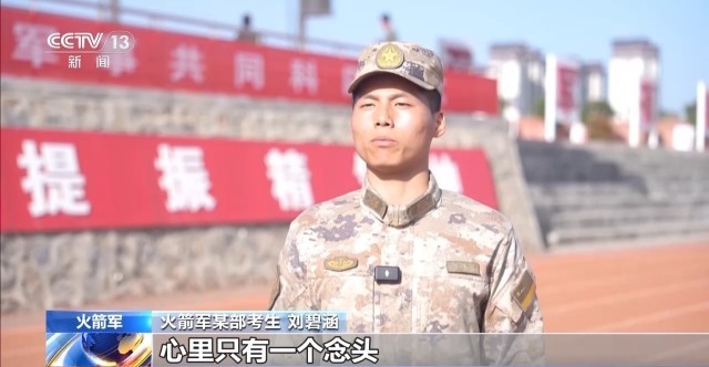 火箭军某部考生 刘碧涵:站在考场上,心里只有一个念头,就是把动作做到位。成绩是对平时训练的检验,后面还有几项考核,保持节奏,稳稳拿下。